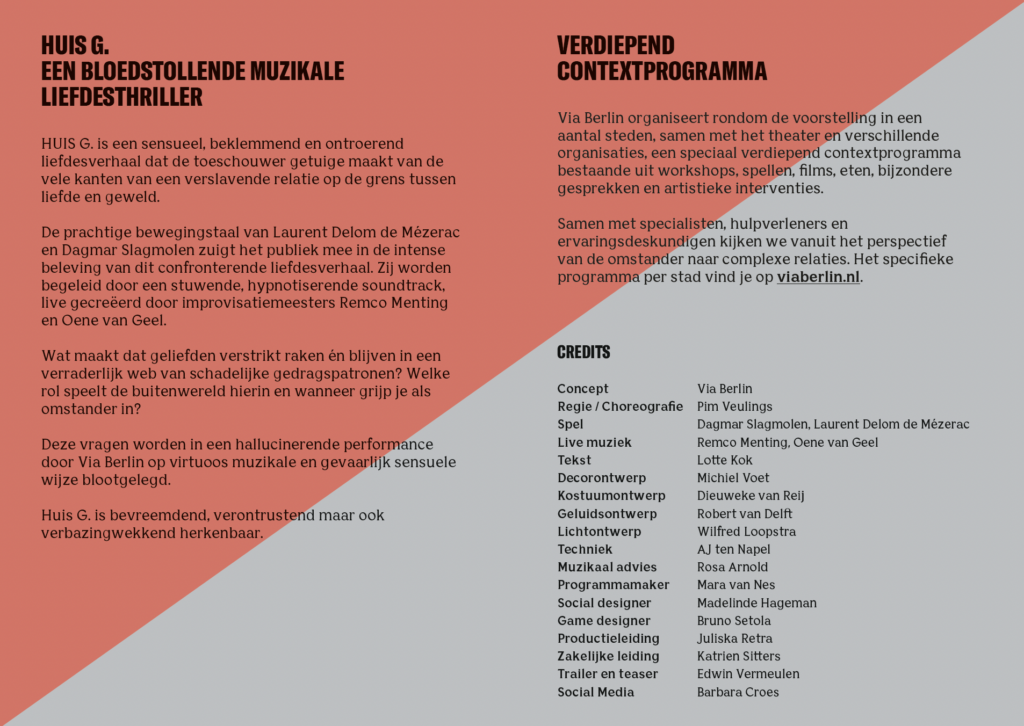 Via Berlin organiseert rondom de voorstelling samen met theaters en verschillende maatschappelijke organisaties (in Gouda, Nijmegen, Haarlem, Amsterdam en Alkmaar) een groter verdiepend contextprogramma bestaande uit workshops, een bijzonder spel, installaties, film, bijzondere gesprekken en artistieke interventies. Samen met publiek, specialisten, hulpverleners en ervaringsdeskundigen kijken we vanuit het perspectief van de omstander naar complexe relaties.